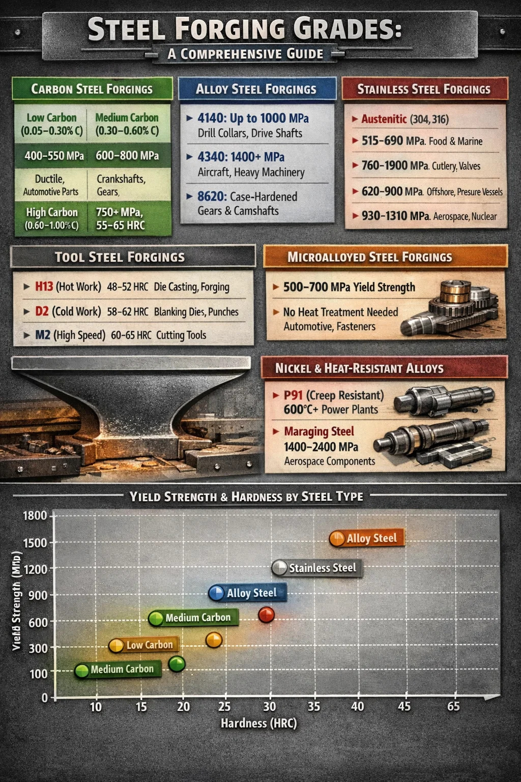 Penempaan baja adalah salah satu proses pengerjaan logam tertua dan paling andal di bidang manufaktur. Jawaban singkat tentang jenis baja tempa yang ada: baja karbon, baja paduan, baja tahan karat, baja perkakas, dan baja paduan mikro adalah lima kategori utama yang digunakan dalam penempaan baja industri. Masing-masing jenis memiliki kebutuhan mekanis dan lingkungan yang berbeda, dan memilih jenis yang salah dapat menyebabkan kegagalan dini, bahaya keselamatan, atau pembengkakan biaya yang tidak perlu.
