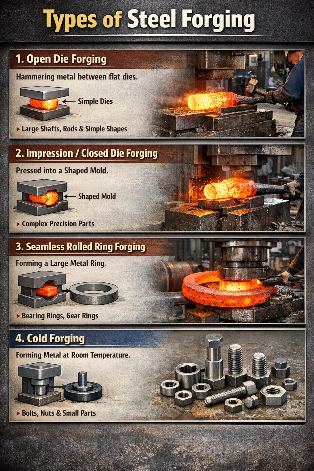 Dalam bidang pengolahan logam, terdapat banyak proses penempaan yang berbeda-beda. Menurut metode klasifikasi yang paling umum, penempaan baja biasanya dapat dibagi menjadi empat kategori berikut: